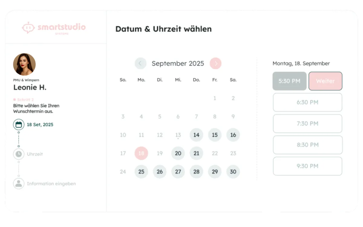 Nie wieder Nachrichten schreiben oder hinterhertelefonieren. Deine Kundinnen buchen sich selbst ihre Behandlungen – direkt über deine Website. Du sparst Zeit, vermeidest DM-Chaos und dein Kalender füllt sich von ganz allein.