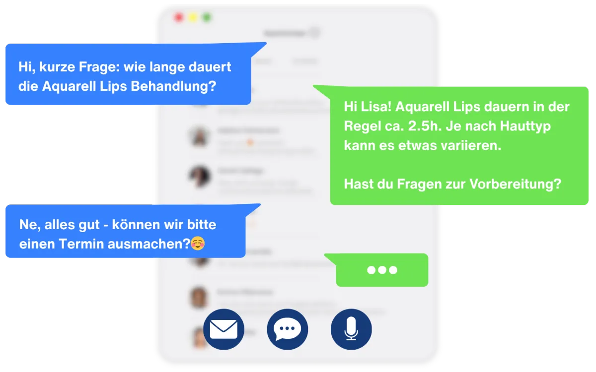 Während du deine Kundinnen verwöhnst, beantwortet dein AI-Chat-Assistent Fragen – und klingt dabei wie ein echter Mensch. Kein Stress, kein Hin und Her. Du gewinnst neue Buchungen, während du offline bist.