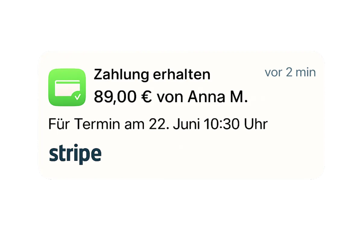 Termine, die bezahlt sind, werden eingehalten. Mit Online-Zahlung sicherst du dir deine Zeit und reduzierst Absagen & Ausfälle um bis zu 90%. Mehr Planbarkeit. Mehr Umsatz. Weniger Leerlauf.