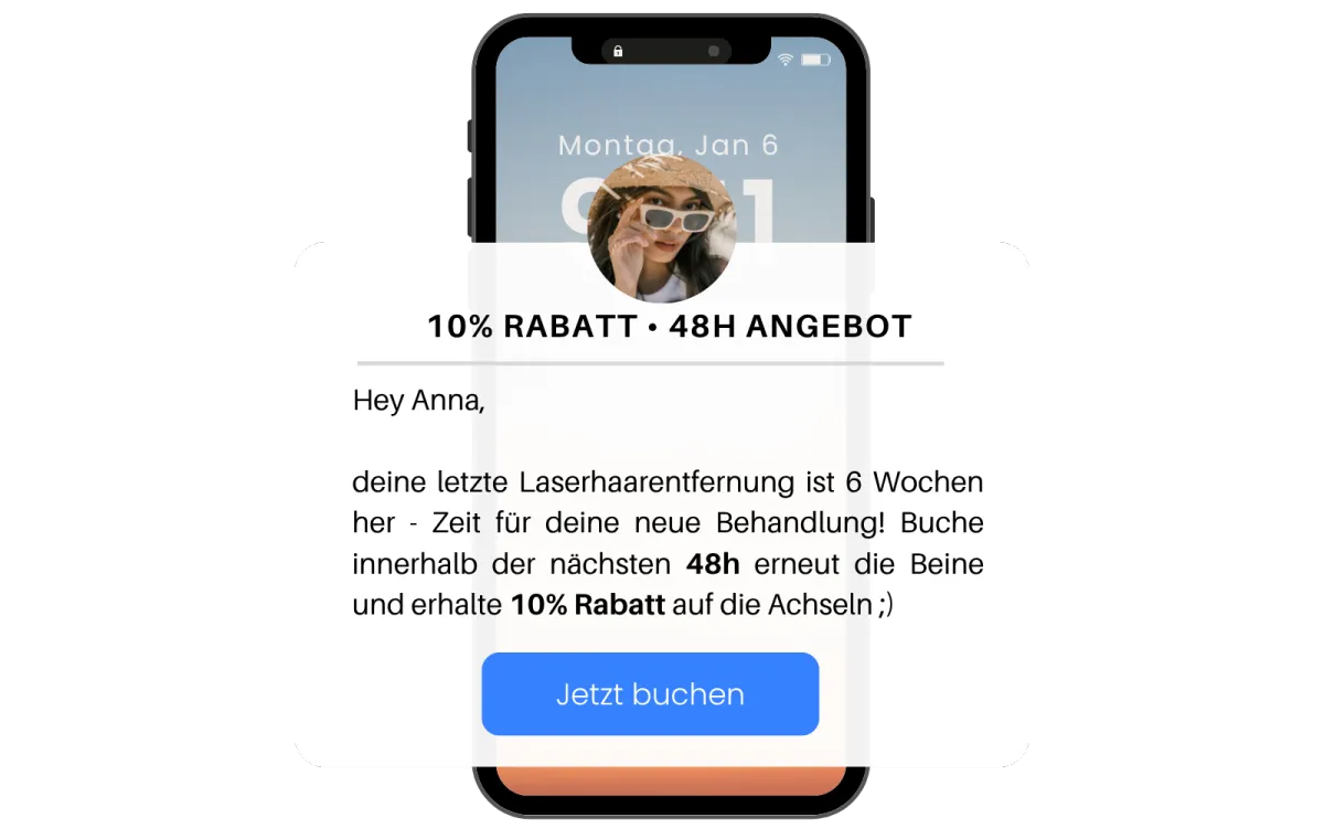 Mehr Umsatz - ohne mehr Aufwand. Dein System meldet sich genau dann, wenn deine Kundinnen bereit für den nächsten Termin sind – charmant, persönlich und automatisch. Du bleibst präsent. Deine Stammkundinnen kommen wieder.